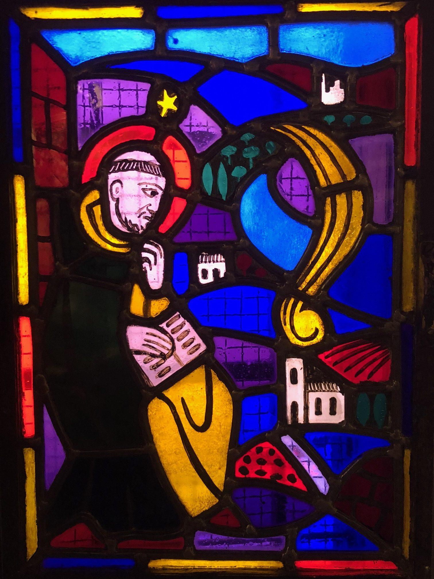 Our first stop in Fanjeaux was to meet and visit with Fr. Renaud Silly, O.P. at “La Maison Saint Dominique.” Fr. Silly warmly welcomed and toured us through the home containing a small room where St. Dominic is believed to have resided for much of his time in Fanjeaux. Walking through a thick wooden door no more than 5 feet high, into St. Dominic’s room was truly a walk back in history. Although the room transformed into a chapel many years ago, it was easy to imagine what it must have been like while occupied by St. Dominic; as Fr. Silly described, it was a place where St. Dominic pondered his loneliness and his calling. The dark wood, tile floors, and fire place are contrasted against the bright stained-glass panels that now cover the one window into the room from the outside. The six stained-glass panels depict important moments in St. Dominic’s life during his time in Fanjeaux. They are beautiful. On a personal note, I experienced a sense of being present and at peace while in the room.
