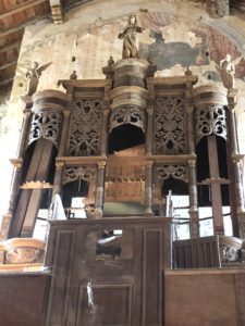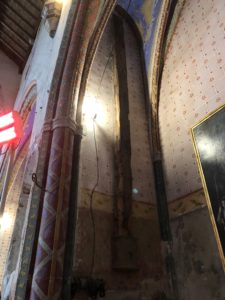 We left the residence and took the few steps to visit “L’Eglise Notre-Dame de l’Assomption.” The current church was built in the late 1270s, early 1280s, more than 50 years after St. Dominic died in 1221. However, the church is built on the same foundation of its predecessor, where St. Dominic preached and served as pastor. Today’s Notre-Dame church is in terrible disrepair, but amid its decay are an array of relics from the time of St. Dominic. The relics are displayed within the church that one easily imagines in its former beauty. Fr. Silly shared so much about Notre Dame’s history and that of the relics it now protects. The church is on France’s list for restoration, which I hope and pray comes to be reality. Among the relics we saw are the “wooden beam” from St. Dominic’s “Fanjeaux Miracle of Fire” experience and what remains of the oldest church pipe organ in southern France. After listening to Fr. Silly, we left the church and went a few doors down to a smaller chapel that now has as its altar one which was unearthed from the basement of the Notre-Dame church. Fr. Silly indicated the altar has been verified to be the original from the church that stood where Notre-Dame does today, and thus, St. Dominic presided over that altar. We were able to see and touch the altar’s consecration crosses; as I realized the significance of that altar, I was overcome with a feeling of humility and a deepened awareness of my presence, a grace, in that moment in that place.