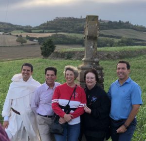 After visiting the churches, we walked to a viewpoint, looking out over the pastoral landscapes that stretch as far as the eye can discern. We also looked down the hills toward the site where St. Dominic saw for three straight nights fire coming down from the sky, pointing him toward Prouilhe, where he would found the convent for his first women followers. Fr. Silly led our group on a long but enjoyable walk down through the winding dirt paths, from the top of Fanjeaux, over hills and through fields that in the late summer are filled with bright yellow sunflowers, to the site of St. Dominic’s fire vision, now marked by a stone cross. The four Dominican presidents on this pilgrimage joined Fr. Silly for a photo with the cross; Fanjeaux is seen at the top of the hill behind us. (In the picture with me, L to R: Fr. Silly; Dr. Robert Gervasi, president of Ohio Dominican University; Dr. Nancy Blattner, president of Caldwell University; Dr. Donna Carroll, president of Dominican University in Illinois).