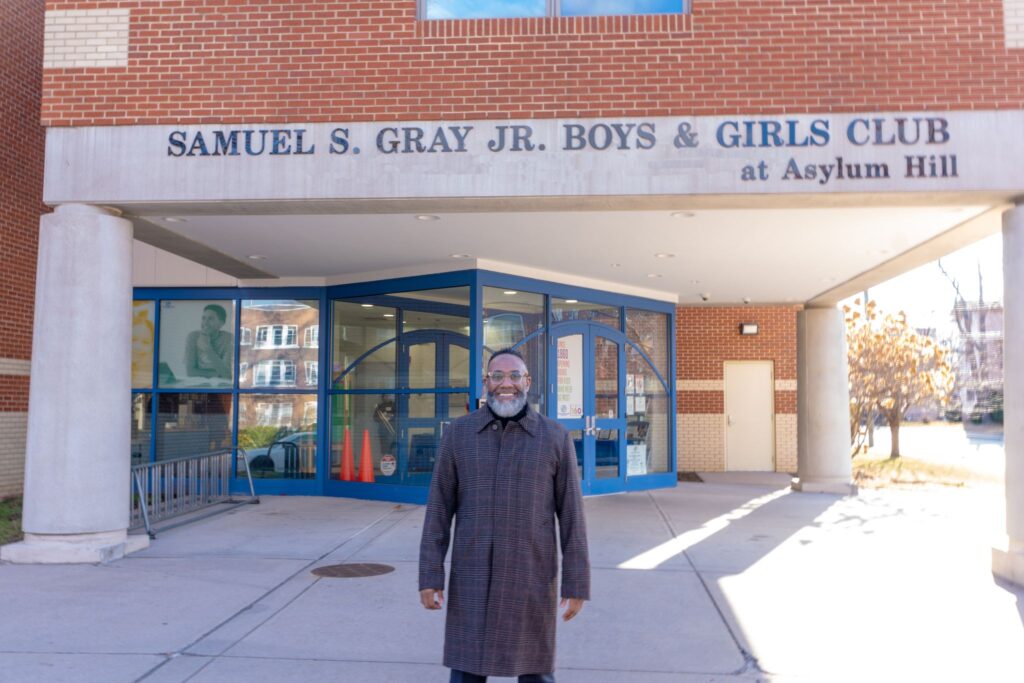 Samuel Gray ‘17, ‘19 MSMOL standing outside the Boys & Girls Club at Asylum Hill in Hartford.